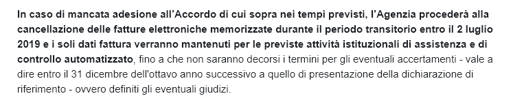 ” In caso di mancata adesione all’Accordo di cui sopra nei tempi previsti, l’Agenzia procederà alla cancellazione delle fatture elettroniche memorizzate durante il periodo transitorio entro il 2 luglio 2019 e i soli dati fattura verranno mantenuti per le previste attività istituzionali di assistenza e di controllo automatizzato, fino a che non saranno decorsi i termini per gli eventuali accertamenti – vale a dire entro il 31 dicembre dell’ottavo anno successivo a quello di presentazione della dichiarazione di riferimento – ovvero definiti gli eventuali giudizi” ;